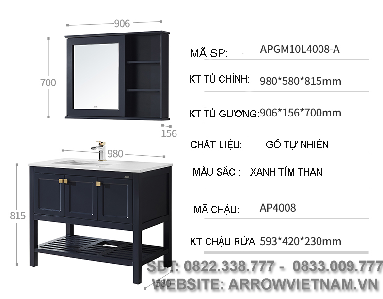Thông số kỹ thuật Bộ tủ phòng tắm APGM10L4008-A