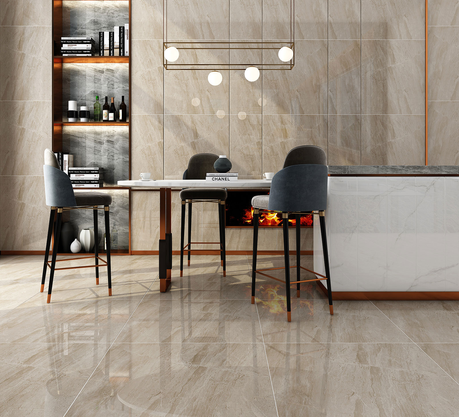 Gạch ốp tường và gạch lát nền vân đá đem đến vẻ đẹp tự nhiên, sự sang trọng và sắc màu tươi mới cho những không gian rộng mở.
